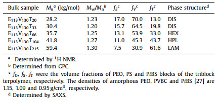 In summary, a series of E113V130Tx triblock terpolymers with the same lengths of PEO (E) and PVBC (V) blocks but various lengths x (20, 33, 66, 104, 215) of PtBS (T) block were synthesized via a two-step RAFT process. The obtained E113V130Tx triblock terpolymers were non-crystalline because the PVBC and PtBS blocks strongly hindered the crystallization of PEO block. With increasing x from 20 to 215, the phase structure of E113V130Tx triblock terpolymers became more ordered and changed from disordered structure, HEX, HPL to LAM phase structures. Such HEX, HPL and LAM phase structures of E113V130Tx triblock terpolymers obtained by thermal-annealing were thermodynamically stable in the temperature range of 30–170 ℃.