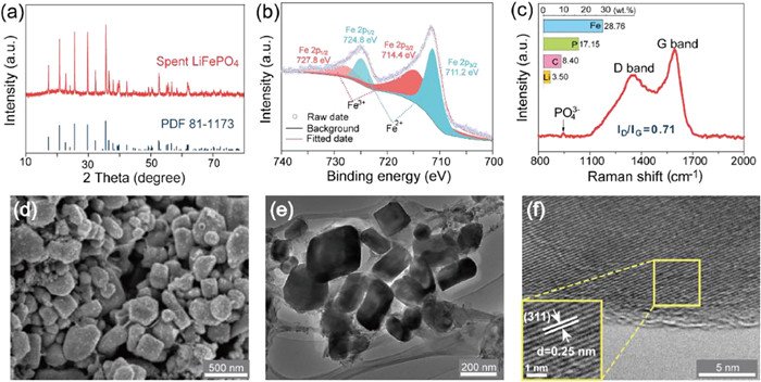 | Fig. 2. Characterization results of spent LiFePO4. (a) XRD pattern. (b) XPS spectra in Fe 2p region. (c) Raman spectrum (inset: mass fractions of Fe, P, C and Li). (d) SEM image. (e, f) TEM images under different magnifications. | |