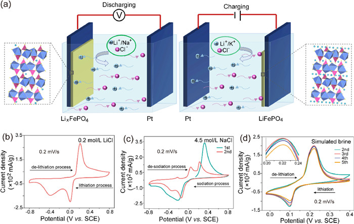 | Fig. 3. (a) Schematic diagram of three-electrode system for extracting lithium from brine (left) and enriching lithium in the recovery solution (right). CV tests of LiFePO4 electrode in (b) 0.2 mol/L LiCl and (c) 4.5 mol/L NaCl. (d) Simulated brine of 0.2 mol/L LiCl and 4.5 mol/L NaCl. | |