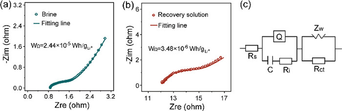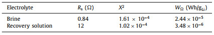 Table 3 According to equivalent circuit, the fitted and tested values of lithiation/de-lithiation in brine and recovery solution, and the corresponding ohmic energy consumption. |