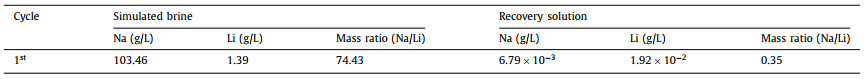 Table 1 The concentration of Na+ and Li+ and mass ratio of Na+ and Li+ in the brine and recovery solution. |