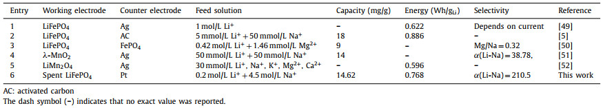 Table 2 Comparison of electrochemical Li+ extraction system with reported systems. |