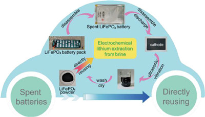 Recovery of spent LiFePO4 powder: At first, the spent LiFePO4 battery pack is pretreated and disassembled, and then the LiFePO4 cathode obtained from the spent LiFePO4 battery after discharge and disassembly. Finally, after ultrasonic vibration, washing, filtration and drying, the spent LiFePO4 powder can be obtained for lithium extraction from simulated brine.