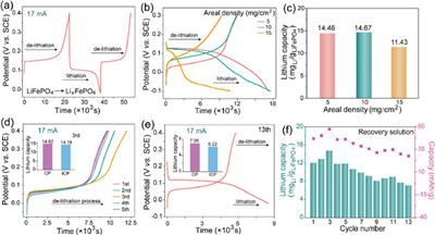 | Fig. 4. CP results of LixFePO4/LiFePO4 lithiation/de-lithiation processes. (a) 1.5 cycles in Li2SO4 solution. (b, c) CP curves and lithium extraction capacity of LiFePO4 electrode with different areal densities. (d) The CP curves of first five cycles in recovery solution at the areal density of 10 mg/cm2 (inset: lithium capacity measured by CP and ICP in third cycle). (e) The CP curves of the 13th cycle (inset: lithium capacity in 13th cycle). (f) The lithium capacity and the corresponding capacity of first 13 cycles. | |