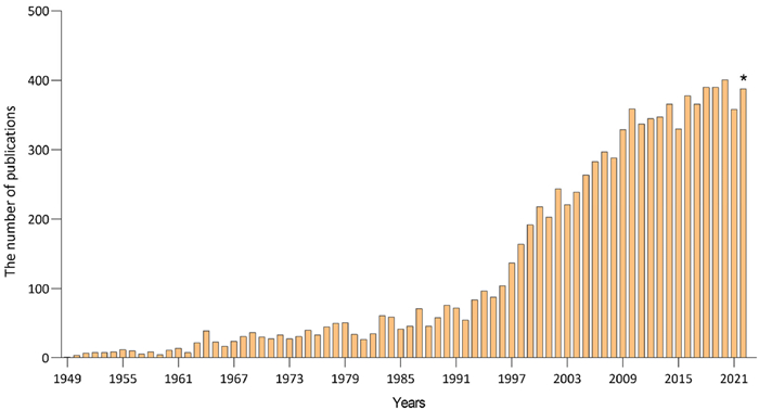 | Fig. 1. The number of publications per year related to iron overloaded diseases since 1949. *: to the end of November 2022 (searched by “iron overloaded diseases”). | |