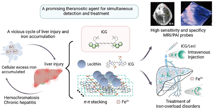 Photoacoustic imaging (PAI), a non-invasive, low-cost imaging technology, that acquires images by analyzing light absorption properties, has gained academic widespread popularity [11]. PAI compensates for the limitations of existing imaging modalities by supplying diagnostic information that would otherwise be unavailable, such as tissue oxygenation levels and high-resolution vascular networks. Lin et al. innovatively proposed the use of PAI as an auxiliary MRI technique for diagnosing iron overload and developed a diagnostic probe compatible with both MRI and PAI. In spite of the fact that ICG can detect the dose of Fe3+ by its absorption peak at 875 nm, it is time consuming and has high detection limit (Fe3+ concentration >3 µmol/L). To solve this issue, supramolecular assembly technology was used to chelate ICG with lecithin, forming an ICG/Leci system. Chelation of metals can increase ordered aggregation and affect ICG's optical properties [12]. ICG/Leci chelation with Fe3+, forming π-π stacking, is specifically characterized by a peak at 890 nm. It was shown that ICG/Leci could significantly improve the efficiency and specificity of Fe3+ detection of PAI at 890 nm. In comparison with ICG alone, ICG/Leci did not significantly alter the signal of MRI for hepatic iron overload diagnosis. Based on these results, ICG/Leci can serve as a multimodal probe for both MRI and PAI for iron overloaded detection.