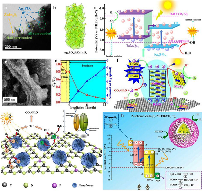 In 2021, Zhang et al. [107] elaborately designed hierarchical Z-scheme Ag3PO4@ZnIn2S4 nanoscoparium through decorating Ag3PO4 nanoparticles on the ZnIn2S4 nanoscopariums (Figs. 10a and b), greatly contributing to tetracycline degradation. The highest tetracycline removal efficiency can reach 92.3% under the optimal component conditions (Ag3PO4@ZnIn2S4-30%) and the system exhibits excellent durability after five successive runs. Additionally, they also detected the reactive oxygen species during the photocatalytic reaction, and found that both superoxide radical (·O2−) and hydroxyl radical (·OH) were involved in the photocatalytic reaction, with ·OH playing the leading role. As shown in Fig. 10c, electrons on the conduction band of Ag3PO4 recombined with holes on the valence band of ZnIn2S4, leaving electrons on the conduction band of ZnIn2S4 and holes on the valence band of Ag3PO4 participating in redox reaction more advantageously. Clearly, it followed a typical Z-scheme mechanism. Besides, Zhang et al. [35] successfully constructed a MoS2QDs@ ZnIn2S4@RGO photocatalyst (Fig. 10d), which can not only purify pollutants such as rhodamine B (RhB), eosin Y (EY), fulvic acid (FA), methylene blue (MB) and p-nitrophenol (PNP), but also produce hydrogen simultaneously without noble metals as co-catalysts. It is worth noting that these dye molecules can also be photoexcited and provide electrons which were further transmitted to the conduction band of ZIS or RGO. That's why the concentration of organics decreased with prolonged irradiation time, whereas the hydrogen evolution still increased obviously (Fig. 10e). The mechanism is clearly depicted in Fig. 10f. With light irradiation, the photogenerated electrons of ZnIn2S4 were transferred to RGO (reduced grapheme oxide) and MoS2QDs to promote hydrogen evolution reaction, while the photogenerated holes were used to oxidize and degrade dye molecules that were adsorbed to catalysts. Zhou et al. [34] synthesized Phosphorus-doped g-C3N4/ZnIn2S4 (PCN/ZIS) heterojunction photocatalyst via a solvothermal method. Improved by the synergistic effect of heterostructure and P doping (Fig. 10g), an enhanced tetracycline degradation activity of 0.0874/min was realized.