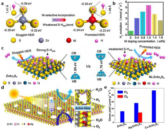 | Fig. 3. (a) The adsorption free energy of H of different neighboring S atoms and S-Hads bond length before and after Ni doping. (b) Photocatalytic hydrogen evolution performance of ZnIn2S4 with different Ni doping quantities. (c) Schematic illustration of photocatalytic hydrogen production process of ZnIn2S4 and Ni-ZnIn2S4. Reprinted with permission [52]. Copyright 2021, Elsevier. (d) Schematic depiction of the dual-defect (Ag dopants and nanoholes) formed on ZnIn2S4 monolayers and the reactive mechanism of the dual-defect structures in photocatalytic overall water splitting. (e) Comparison of the photocatalytic H2 and O2 evolution behaviors of ZnIn2S4, Ag-ZnIn2S4, and Cu-ZnIn2S4 under visible light illumination (300 W xenon lamp, λ > 420 nm). Reprinted with permission [53]. Copyright 2021, American Chemical Society. | |