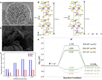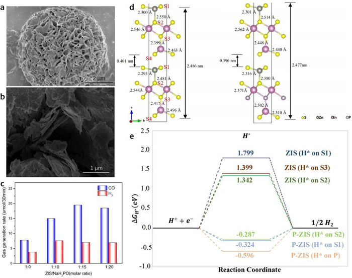 | Fig. 4. SEM image of (a) ZIS and (b) P-ZIS. (c) The effect of ZIS/NaH2PO4 ratio on the photocatalytic CO2 reduction. Reprinted with permission [59]. Copyright 2021, American Chemical Society. (d) Simulated crystal structure for pristine ZIS, and P-ZIS (SPD-3). (e) Free energy diagram for hydrogen evolution for each site on ZIS and P-ZIS. Reprinted with permission [60]. Copyright 2022, Springer Nature. To sum up, exotic-atom doping is undoubtedly a pivotal method to enhancing the catalytic activity of ZnIn2S4 nanosheets: (1) adjust band gap and extend light absorption range; (2) improve electric conductivity; (3) form defects and increase active sites; (4) facilitate reactant adsorption and desorption. | |