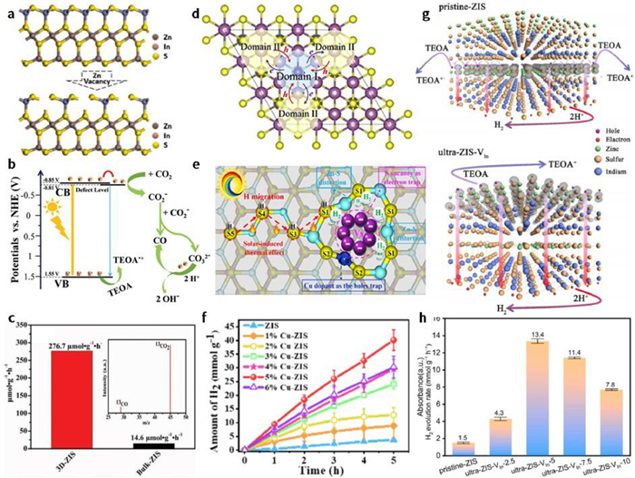 Liu et al. [74] prepared defective ZnIn2S4 microspheres with rich S vacancies via a solvothermal method and a low-temperature hydrogenation route. As shown in Fig. 5d, the introduction of S vacancies narrowed bandgap and induced surface domain potential difference which improved light harvest capability and promoted electrons to transfer from S vacancies to adjacent favorable domain and facilitated spatial electron-hole separation. Therefore, the defective ZnIn2S4 microspheres outperformed pristine ZnIn2S4 without S vacancies. Zhang et al. [75] introduced hetero-atom Cu elaborately via substituting the Zn atom of ZIS. Due to electron nonequilibrium and lattice mismatch caused by Cu confinement, a self-adapting S vacancy was induced because of Jahn-Teller distortions (Fig. 5e). Atomic Cu and Vs synergistically modulate charge separation with Vs being an electron trap and Cu acting as a hole trap. Besides, regulated by Vs and driven by photo-thermal effect, an efficient channel of gradient H migration was constructed. The optimum 5%Cu-ZlS nanosheets with S vacancy exhibit remarkable photo-catalytic HER performance compared with pristine ZnIn2S4 (Fig. 5f). Besides, Wang et al. [76] elaborately synthesized a sulfur-deficient ZnIn2S4/oxygen-deficient WO3 composite with C-wood as a photothermal substrate. S and O vacancies improved carrier utilization and light absorption behavior, promoting ZnIn2S4 and WO3 to produce hydrogen and oxygen, respectively. Moreover, C-wood as an electron bridge also induced photothermal effect which transformed liquid water into water vapor and was more conductive to water splitting. Under these synergistic effects, this photocatalytic system exhibited 169.2 and 82.5 µmol/h for H2 and O2 production, respectively.
