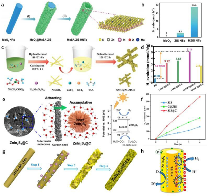 | Fig. 6. (a) Schematic diagram of synthetic process for the MoSA-ZIS HNTs photocatalyst. (b) The rates of photocatalytic H2 evolution over MoO3 NRs, ZnIn2S4 NSs and MoSA-ZIS HNTs. Reprinted with permission [91]. Copyright 2021, Springer. (c) Synthetic scheme of NMO@M-ZIS-N. (d) The photocatalytic HER rate of ZIS and NMO@M-ZIS-N with different NMO loading (TEOA as a sacrificial agent). Reprinted with permission [92]. Copyright 2022, The Royal Society of Chemistry. (e) Schematic illustration of the process of capturing the water molecules and a possible photocatalytic mechanism of the HER. (f) Hydrogen evolution activities of ZIS, ZIS@C and C@ZIS (λ ≥ 420 nm). Reprinted with permission [93]. Copyright 2021, American Chemical Society. (g) Schematic illustration for the synthesis of ZnIn2S4-MOFL. (h) Schematic illustration of photocatalytic mechanism of ZnIn2S4-MOFL. Reprinted with permission [94]. Copyright 2021, Elsevier. | |