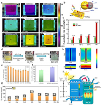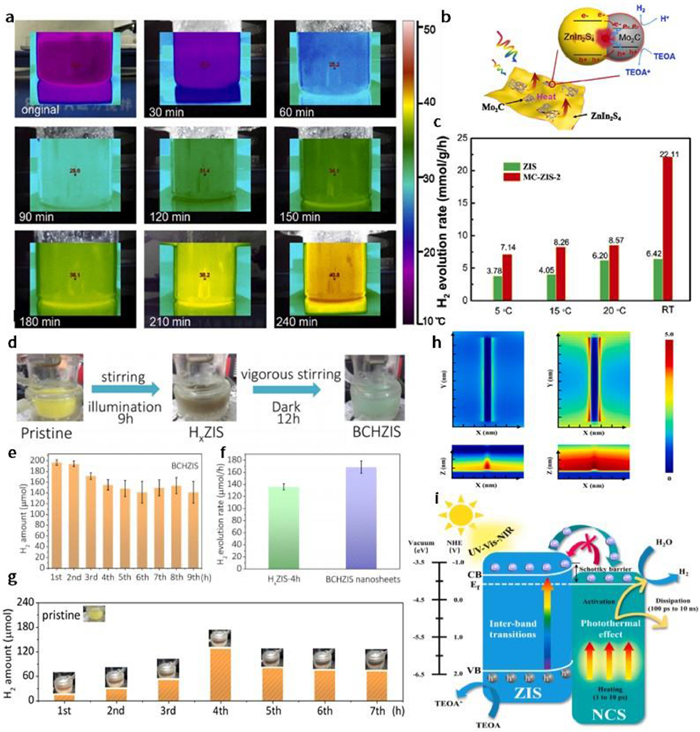 | Fig. 7. (a) Photothermal mapping images under visible irradiation in the photocatalytic process. (b) Schematic illustration of the band structure over 2D ZnIn2S4/amorphous Mo2C nanoparticles for photocatalytic H2 generation process. (c) H2 evolution rates of ZIS and MC-ZIS-2 at different temperature. Reprinted with permission [95]. Copyright 2020, Elsevier. (d) Schematic illustration of hydrogenation process. (e) Photocatalytic H2 production rate over BCHZIS per hour. (f) Comparison of photocatalytic H2 production rate between HxZIS-4h and BCHZIS. (g) Hydrogen evolution amount and the corresponding color change of the ZIS nanosheets. Reprinted with permission [32]. Copyright 2019, Elsevier. (h) FDTD simulation results of NCS/ZIS under wavelengths of 420 nm (left) and 750 nm (right). (i) The possible photocatalytic mechanism of NiCo2S4/ZnIn2S4. Reprinted with permission [96]. Copyright 2022, Elsevier. | |