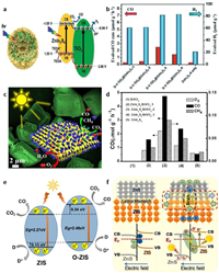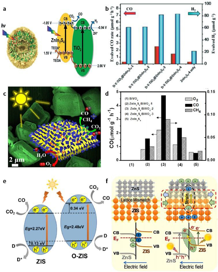 She et al. [98] prepared spike-like double yolk-shell structure TiO2@ ZnIn2S4 for CO2 reduction to syngas. As shown in Fig. 8a, under light irradiation, the photogenerated electrons of ZnIn2S4 could be transferred to the conduction band of TiO2 and participated in the CO2 reduction and hydrogen evolution reactions. Such an elaborate structure can provide more active sites, improve light absorption and reduce charge transfer path. Additionally, it was also found that the CO2 reduction activity increased at first and then decreased with ZnIn2S4 loading amount increasing (Fig. 8b). The optimal reduction performance is 325.29 µmol/g and 227.18 µmol/g for CO and H2, respectively. Han et al. [99] elaborately designed a ZnIn2S4/BiVO4 hierarchical heterostructure by assembling ZnIn2S4 nanosheets on BiVO4 decahedron (Fig. 8c) in a hydrothermal and solvothermal route. The as-prepared composite exhibited an enhanced photocatalytic activity for O2, CO and CH4 evolution compared with bare ZnIn2S4 and BiVO4 (Fig. 8d).