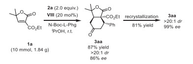 With the optimal conditions in hand, structural diversity of α, β-unsaturated ketones were then examined. As demonstrated in Scheme 2, a wide range of aryl α, β-unsaturated ketones substituted with either electron-withdrawing and electron-donating group on the aromatic ring and heteroaromatic α, β-unsaturated ketones were found to be well tolerated in this transformation. For example, the α, β-unsaturated ketones holding electron-releasing substituents, such as alkyl, amine and ether, smoothly reacted with furanone 1a, affording 3ab-3af in excellent yields with good to excellent diastereo- and enantioselectivity. Electron-deficient α, β-unsaturated ketones containing halide, nitro, cyano, trifluoromethyl and ester functional groups were all successfully applied in this approach (3ag-3ar). With the variation of the steric effect at the phenyl ring, the stereoselectivities remained excellent (3as-3aw). The dr values of products 3aj and 3ar were 4.6:1 and 3:1 when the aryl possessed the 4-nitro and 3-nitro groups substituent, respectively. Noteworthy, the heterocyclic unsaturated ketones also proceeded smoothly with good to excellent enantioselectivities (3ax-3ab'). Alkyl substituted α, β-unsaturated ketones were not suitable in this transformation resulting in low yields. Furthermore, the α-methyl ester substituted furanone was applicable to this asymmetric synthesis, affording the corresponding product 3bd. The cyclohexyl substituted at the γ-position of furanone also worked well to yield the product 3cd. In addition, the optimized conditions were applied in a scale up process (10 mmol) in which the chemical and optical yields were sustained well. It should be noted that the ee value could be easily improved to 99% after recrystallization (Eq. 1).