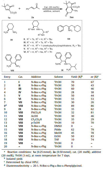 Initially, model reaction by condensation of γ-bis-methyl-α-ethylfuranone 1a and benzal acetone 2a was used to optimize the reaction condition. The corresponding results are shown in Table 1. We firstly investigated the activity of catalysts Ⅰ-Ⅸ, a range of chiral primary amine catalysts. We envisaged that a catalyst with neighboring bulky substituents of the primary amine group could improve the enantioselectivity. Therefore, the (1S, 2S)-cyclohexane-1,2-diamine Ⅰ was chosen as the catalytic backbone, which is readily available from cheap amino acids, and the tert‑butyl group was introduced into the catalyst backbone to investigate the effect of secondary and tertiary amines on enantioselectivity and product yield (Table 1, entries 1–9). Unfortunately, changing the substituent groups at the R1 and R2 positions of catalyst Ⅱ and Ⅲ, which with a tert‑butyl group at the R3 position, did not improve the enantioselectivity (Table 1, entries 2 and 3). Moreover, the catalysts Ⅳ, Ⅴ, Ⅵ and Ⅶ with different substituents also failed to increase the efficiency (Table 1, entries 4–7). To our delight, the use of (1R, 2R)−1,2-diphenylethane-1,2-diamine Ⅷ as catalyst resulting in good yield, enantioselectivity and diastereoselectivity (Table 1, entry 8). Next, the tridentate N3-catalyst Ⅸ provided ineffective (Table 1, entry 9). Subsequently, we optimized the reaction by using various additives in the presence of catalyst Ⅷ and found that both weak acid additives AcOH and PhCO2H and stronger acid CF3CO2H and p-TsOH gave lower enantioselectivity and yields than N-Boc-L-Phg (Table 1, entries 10–13). Further screening of the solvent indicated that iPrOH is better than DMSO, PhMe, MeOH, EtOH, and THF (Table 1, entries 14–18). Finally, control experiments demonstrated that the organo-catalyst and acid additive are both essential for the success of this transformation (Table 1, entries 19 and 20).