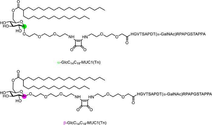 In this work, we used GlcC14C18, which has a simpler structure and lower toxicity among Mincle ligands, as an adjuvant. We coupled it with the tumor antigen MUC1 to obtain a glycopeptide antitumor vaccine against MUC1. Because GlcC14C18 has two stereo configurations, α and β, we obtained single-configuration α-GlcC14C18 and β-GlcC14C18 through two different synthetic routes, and then constructed α-GlcC14C18-MUC1 and β-GlcC14C18-MUC1 polypeptide as two vaccines through peptide solid-phase synthesis (Fig. 1). We compared the ability of the two stereoisomeric vaccines to induce tumor antigen-specific antibodies and cellular immune responses and found that β-GlcC14C18-MUC1 induced stronger immune responses in vivo. Our study provides a theoretical support that the immunostimulatory activity induced by adjuvant-receptor binding depends not only on the specific chemical structure of the adjuvant molecule, but also on the spatial complementarity of the structure and its receptor.