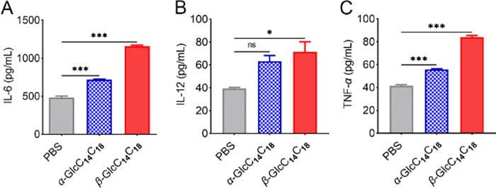 | Fig. 2. The production of pro-inflammatory cytokines (IL-6 (A), IL-12 (B) and TNF-α (C)) from mouse peritoneal macrophages stimulated by α-GlcC14C18 and β-GlcC14C18. Three pro-inflammatory cytokines of the cell medium supernatant of mouse peritoneal macrophages incubated with α-GlcC14C18 and β-GlcC14C18 were analyzed by ELISA. Data are shown as mean ± SD. Differences are determined by one-way ANOVA analysis, ns = not significant, *P < 0.05, **P < 0.01, ***P < 0.001. | |