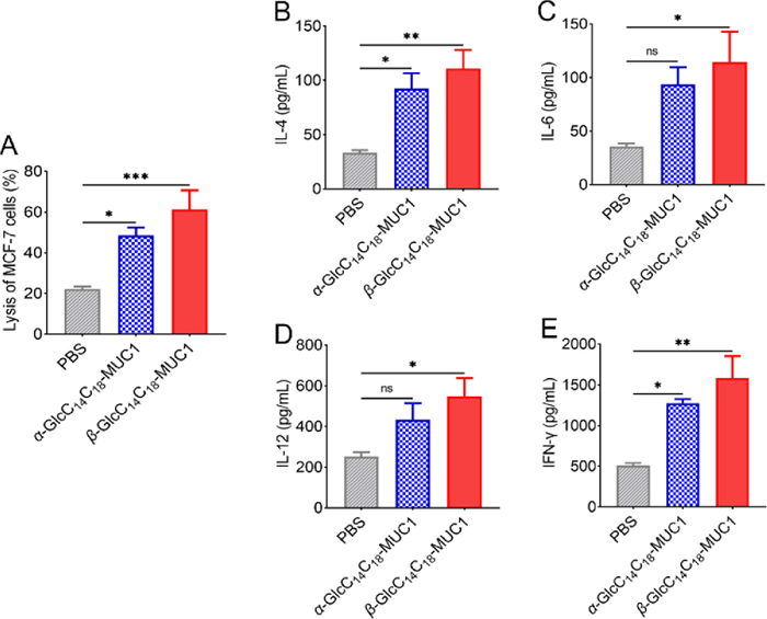 Cytotoxic T cells can eliminate tumor cells by releasing killing factors. In order to evaluate the killing effect of cytotoxic T cells on tumor cells induced by vaccines, CTL experiments were conducted. The collected mouse splenocytes used as effector cells and MCF-7 as target cells were co-incubated at a cell number ratio of 50:1, and then detected by a microplate reader. As shown in Fig. 4A, the splenocytes of mice immunized with α-GlcC14C18-MUC1 and β-GlcC14C18-MUC1 have a killing rate of 47% and 60%, respectively. So, the splenocytes of the mice immunized with the two vaccines have a certain killing rate on the tumor cells. To a certain extent, the ability of the β-GlcC14C18-MUC1 vaccine may be slightly stronger than α-GlcC14C18-MUC1.