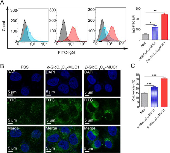 Then, for measure the binding properties of the antiserum with tumor cells, we used flow cytometry and laser scanning confocal microscope. The MCF-7 cells with high expression of MUC1 were incubated with the collected antisera. After a period of time, goat anti-mouse IgG conjugated with the FITC fluorescence channel was added for co-incubation, and the cell surface fluorescence was detected by flow cytometry and laser scanning confocal microscope. As shown in Figs. 5A and B, the antisera induced by the two vaccines can effectively bind to tumor cell surface antigens, and the antisera induced by β-GlcC14C18-MUC1 has better binding affinity than the antisera induced by α-GlcC14C18-MUC1. Therefore, the antiserum induced by β-GlcC14C18-MUC1 has stronger binding capacity than that of α-GlcC14C18-MUC1.