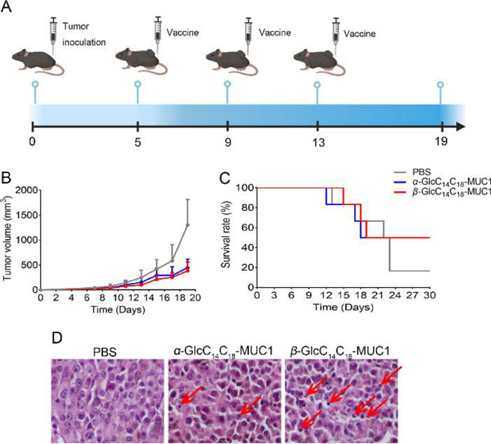 | Fig. 6. The therapeutic effect of α-GlcC14C18-MUC1 and β-GlcC14C18-MUC1 on tumors. (A) Immune flowchart of the treatment process. After establishing the tumor-bearing mouse model, the vaccine candidates were injected for 3 times. (B) Growth curve of tumor volume in mice after injection of vaccine candidates (n = 6). When the tumor diameter reached 5 mm, they were measured every 2 days for a total of 7 times. (C) Survival curve of tumor-bearing mice after vaccination (n = 6). (D) Pathological sections of tumor tissue stained by hematoxylin and eosin. Inflammatory cells are indicated by the red arrows. | |