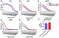 | Fig. 3. Analysis of antibody titers and antibody subtypes induced by the vaccine candidates. (A) The antibody titers of the mouse serum induced by α-GlcC14C18-MUC1 and β-GlcC14C18-MUC1 were detected by ELISA. Data are shown as mean ± SD. The antibody subtypes IgG1 (B), IgG2b (C), IgG2c (D) and IgG3 (E) of the mouse serum induced by α-GlcC14C18-MUC1 and β-GlcC14C18-MUC1 were detected by ELISA. The plates were coated by MUC1 (Tn). (F) The ratio of IgG2b/IgG1. Data are shown as mean ± SD. | |
