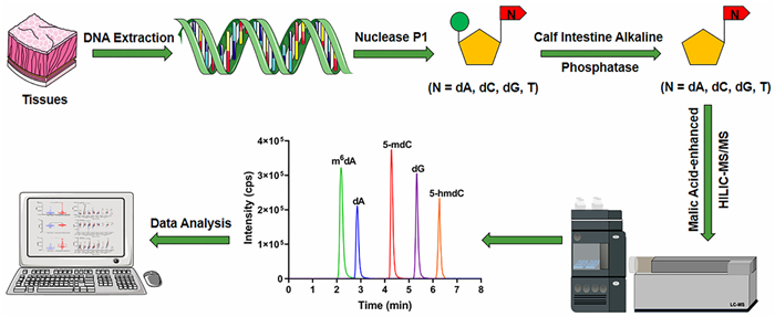 | Fig. 1. Schematic diagram to illustrate the analytical procedures for the analysis of m6dA, 5-mdC and 5-hmdC in human tissues. Genomic DNA was isolated from tumor and matched tumor-adjacent normal tissues from various types of cancer patients, followed by enzymatic digestion and malic acid-enhanced HILIC-MS/MS measurement. | |