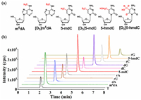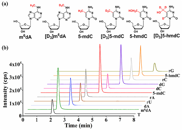 | Fig. 2. (a) The chemical structures of m6dA, 5-mdC, 5-hmdC and their stable isotope-labeled internal standards. (b) The MRM chromatograms of rA, rC, rG, rU, dA, dC, dG, T, m6dA, 5-mdC and 5-hmdC standards. The concentration of rU was 300 nmol/L. For other nucleosides, the concentration was 100 nmol/L each. | |