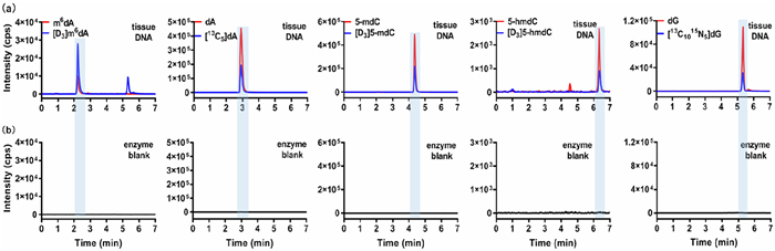 | Fig. 3. Identification of m6dA, dA, 5-mdC, 5-hmdC and dG in human tissues. (a) MRM chromatograms of m6dA, dA, 5-mdC, 5-hmdC, dG and their corresponding stable isotope-labeled internal standards in a human tissue sample. (b) MRM chromatograms of m6dA, dA, 5-mdC, 5-hmdC and dG in enzyme blank samples, which only contain enzymes used for digesting DNA. | |