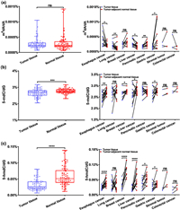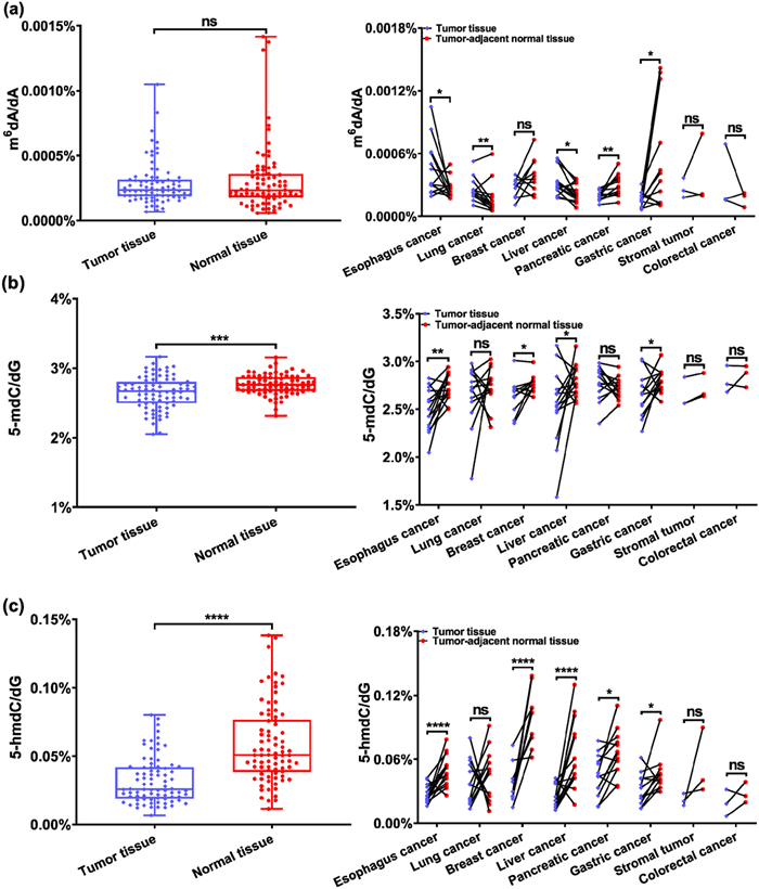 | Fig. 4. Quantification results of (a) m6dA, (b) 5-mdC, and (c) 5-hmdC in 82 pairs of tumor tissues and matched tumor-adjacent normal tissues. ns, P > 0.05; *P < 0.05; **P < 0.01; ***P < 0.001; ****P < 0.0001. | |