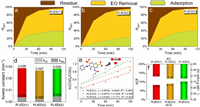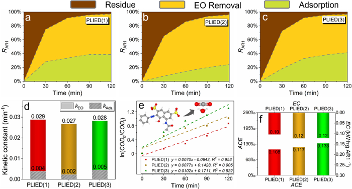 | Fig. 2. Azophloxine degradation performance of PLIED electrodes, (a-c) acid red 1 removal by electrochemical oxidation and adsorption (100 mg/L AR1, 10 g/L Na2SO4, j = 30 mA/cm2 for 120 min), (d) kinetic constants of electrochemical oxidation and adsorption, (e) COD removal kinetics, (f) average current efficiency and energy consumption during the degradation processes. | |