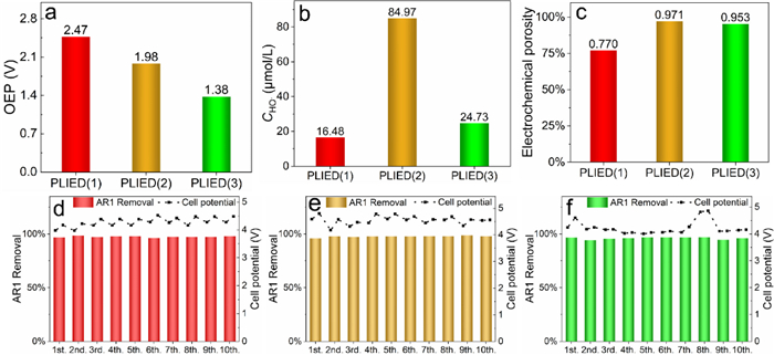 To understand the degradation performance of the PLIED electrodes, the electrochemical activity of the electrodes is characterized. Fig. 3a shows the oxygen evolution potential (OEP) of PLIED electrodes from the cycle voltammetric curves shown in Fig. S6 (Supporting information). The lowest OEP and the highest current response (Fig. S6g) displayed by PLIED(3) explain its degradation performance. A high current response means a fast electrode reaction rate that makes the degradation process susceptible to mass transport situations under different concentrations. PLIED(2) shows high OEP and the highest hydroxyl radical productivity that entitle the electrode to excellent degradation performance, which is not affected by the property and concentration of pollutants to some extent. The highest OEP is exhibited by PLIED(1) because of the lowest hydroxyl radical productivity (Fig. 3b), which partly seems to conflict with its degradation performance. Cycle voltammetry (CV) curves (Fig. S6a) shown the stable presence of reversible redox couple, thus bringing the property of "active anode" into PLIED(1) to cover the shortage of hydroxyl radical [21]. Moreover, electrochemical porosity calculated from CV results (Figs. S6b, c, e, f, h, i) are shown in Fig. 3c, which suggests the electrochemical activity of the internal surface of the porous coating [22]. The high electrochemical porosity indicates the application potential of PLIED electrodes in a rising flow-through reaction system [23].