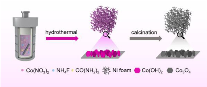 The self-supported Co3O4 NSA electrocatalyst was synthesized via a two-step template-free approach (Fig. 1). In the hydrothermal process, urea was used to provide a basic condition to form Co(OH)2 precursor and also a mineralizer to promote the crystallization of hexagonal nanosheet arrays [19]. The NH4F could play an important role in regulating the growth of the Co(OH)2 nanosheets on the Ni foam substrate [19]. Thereafter, the formed Co(OH)2 was thermally converted into spinel Co3O4 nanoarray supported on the Ni foam, as described by a simple oxidation reaction as follows: 3Co(OH)2 + 1/2O2 → Co3O4 + 3H2O. This method is facile and cost-effective to synthesize large-scale self-supported Co3O4 NSA electrodes with high robustness and conductivity, which is promising for practical electrode manufacture.