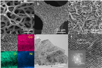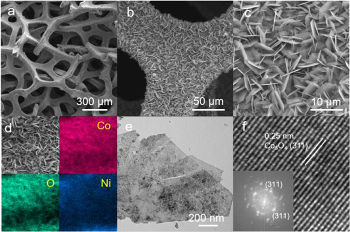 | Fig. 2. (a-c) SEM images of the Co3O4 NSA/Ni foam with different magnifications; (d) EDS mapping, (e) TEM image, (f) HRTEM and SAED images of the Co3O4 NSA/Ni foam. | |