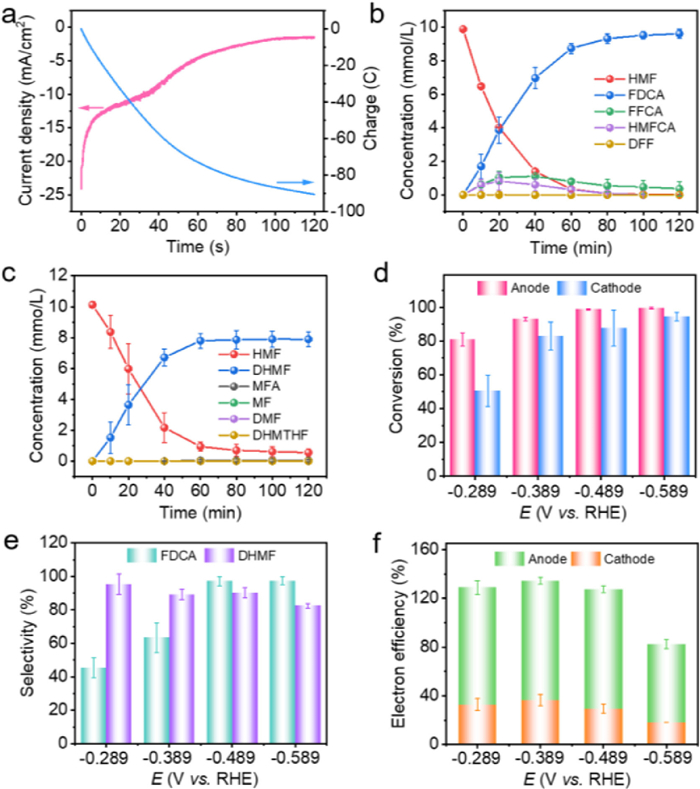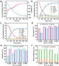 | Fig. 4. (a) Current-time and charge-time plot in paired electrolysis at −0.489 V vs. RHE. (b) Concentration changes of HMF and its reduction products in cathode reaction, (c) concentration changes of HMF and its oxidation products in anodic reaction when cathode potential was set at −0.489 V vs. RHE. (d) HMF conversion ratios, (e) DHMF and FDCA selectivities, and (f) electron efficiencies on both sides at different potentials. | |
