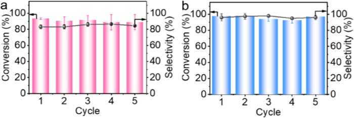 | Fig. 5. HMF conversion ratios and product selectivities on (a) cathode and (b) anode in five cycles. | |