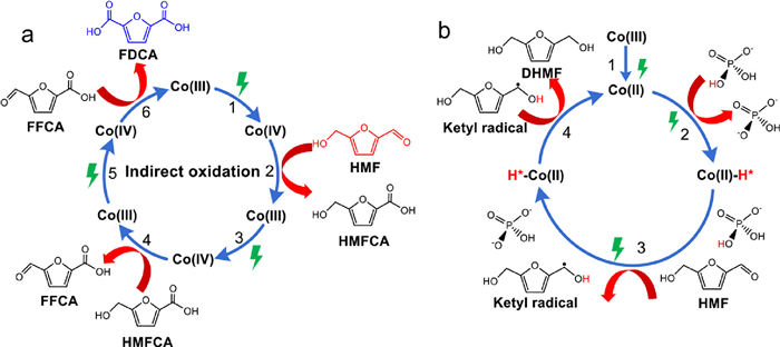 | Fig. 6. The proposed mechanism for (a) electrocatalytic oxidation and (b) hydrogenation of HMF over Co3O4 NSA electrocatalyst. | |