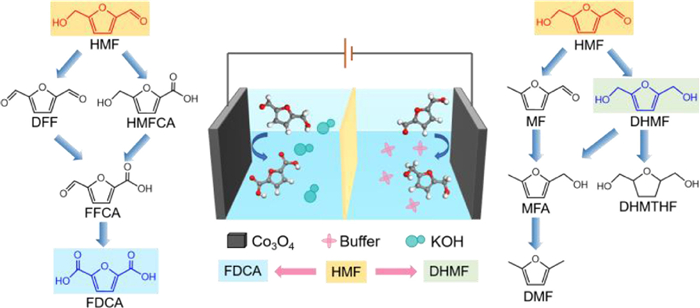 The electrochemical method offers a promising way to replace the conventional heterogeneous catalytic system because of its advantages such as mild operating conditions, dispensing with noble-metal-based catalysts and easily controlled reaction process [5]. However, a typical electrochemical process usually involves two half-reactions occurring in pairs, yet many commercialized electrochemical production technologies utilize only one half-reaction to obtain desired products. For example, the cathodic HMF electrochemical reduction is usually paired with anodic water oxidation, which has sluggish kinetics and its main product oxygen gas is not valuable [6]. On the other hand, the anodic HMF oxidation is often paired with cathodic water reduction, in which less-value, flammable and combustible H2 is a primary product [7].