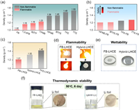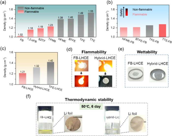| Fig. 1. (a) Summary of density and flammability of common diluents. (b) Flammability of different HFE–FB combinations. (c) Density of the three LHCE. (d) Ignition test of FB-LHCE and hybrid-LHCE. (e) Wettability of different LHCE to separator. (f) Images of different LHCE and the immersed Li foils after 6 days storage at 50 ℃. | |