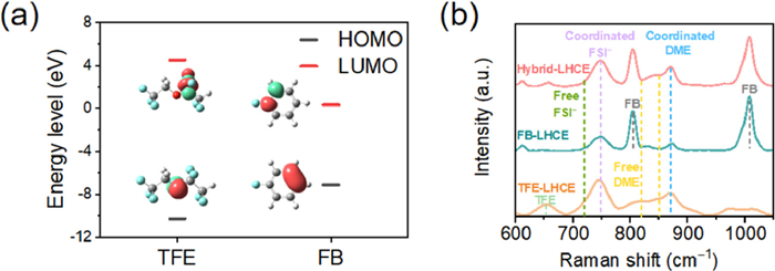 | Fig. 2. (a) Energy level and visual HOMOs and LUMOs of TFE and FB. The red and green regions represent the positive and negative parts of orbitals, respectively. Color mapping for elements: H-white, C-grey, O-red, F-cyan. (b) Raman spectra of FB-LHCE, TFE-LHCE and hybrid-LHCE. | |