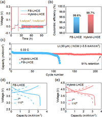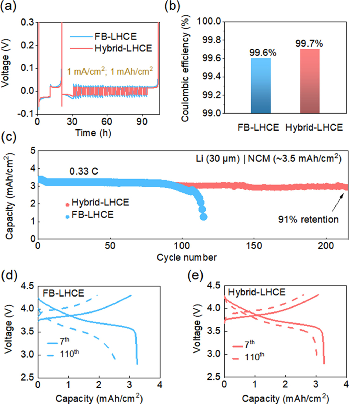 | Fig. 3. (a, b) CE of Li|Cu half cells using different electrolytes. (c) Cycling performance of Li|NCM523 full cells with FB-LHCE and hybrid-LHCE at 0.33 C after seven formation cycles. Corresponding charge/discharge curves of Li|NCM523 full cells cycled in (d) FB-LHCE and (e) hybrid-LHCE. | |