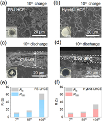 | Fig. 4. Li deposition morphology in (a) FB-LHCE and (b) hybrid-LHCE at the 10th deposition. The Li anodes were retrieved from Li|NCM523 batteries (at the 10th charge state). Cross-sectional views of cycled Li anodes retrieved from Li|NCM523 batteries (at the 10th discharge state) with (c) FB-LHCE and (d) hybrid-LHCE. The evolution of interfacial resistance of Li|NCM523 batteries with (e) FB-LHCE and (f) hybrid-LHCE. | |