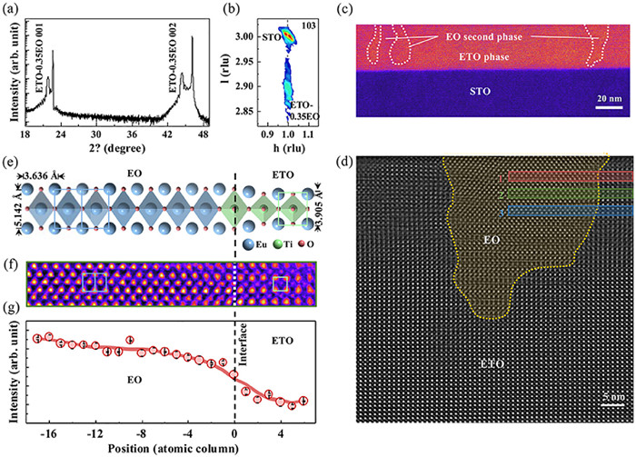 | Fig. 1. Structural characterizations of ETO-0.35EO thin film. (a) XRD θ−2θ scan of an ETO-0.35EO film. (b) RSM around the (103) plane of the substrate. (c) Low-magnified cross-sectional STEM image of an ETO-0.35EO film grown on STO substrate. Dashed white circles mark the EO second phase region. (d) High-magnified HAADF-STEM image of representative interphase between ETO and EO. Boundaries between the two phases are indicated by yellow dashed lines. (e) Schematic and (f) STEM image of an atomic-scale interphase structure. (g) Averaged intensity profile extracted from regions 1 to 3 in (d). Error bars are the standard deviation. | |