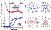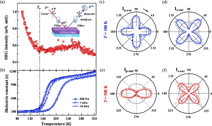 | Fig. 3. Polar state in ETO-0.35EO thin film confirmed by SHG and dielectric spectra. Temperature-dependent (a) SHG intensity and (b) dielectric spectra of an ETO-0.35EO film. Inset shows the schematic diagram of the SHG setup carried out in the reflective mode. The p- and s-polarized lights were incident on the films with an angle of 45° with respect to the incident plane. Ip-out and Is-out signals were collected as a function of polarized angle (φ) at (c, d) 100 K and (e, f) 300 K, respectively. Open circles and solid lines represent the experimental data and theoretical fits, respectively. Dielectric spectra were measured at different frequencies (f = 500 Hz, 1 kHz, and 10 kHz). | |