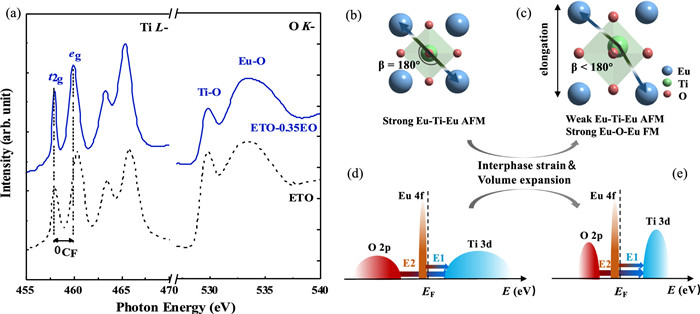 | Fig. 4. Manipulation of electronic state in ETO-0.35EO thin film by interphase strain. (a) XAS at Ti L- and O K-edges in an ETO-0.35EO film. The dashed lines show the reference spectra for Ti4+ [37] and O K-edges in the stoichiometric ETO films. Schematic diagram of dominant magnetic interactions in (b) unstrained ETO films and (c) interphase-strained ETO films. Corresponding electronic band structures of (d) unstrained and (e) interphase-strained ETO films. E1 represents the band gap between the Eu and Ti orbitals whereas the E2 represents the band gap between Ti and O orbitals. | |