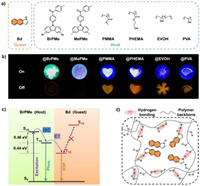 | Fig. 1. (a) The molecular structures of Bd guest and organic hosts including BrPMe, MePMe, PMMA, PHEMA, EVOH and PVA. (b) Luminescent photographs of 1.2 mol% Bd@BrPMe, 1.5 mol% Bd@MePMe, Bd@PMMA, Bd@PHEMA, Bd@EVOH and Bd@PVA captured using Apple 12 Camera before and after turning off the excited UV light (298 K, λex = 365 nm, the Bd content doped in polymers was 1.0 wt%). (c) The energy level distribution diagram of BrPMe and Bd. The energy level of BrPMe was calculated from the spectra of its powder, while the energy level of Bd was calculated from the spectra of 1.0 wt% Bd@PMMA system. ISC: intersystem crossing; ET: energy transfer. (d) Schematic diagram of intermolecular hydrogen bonding interaction between Bd and polymers, and hydrogen bonding interaction among the polymers themselves. | |
