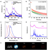 | Fig. 2. (a) Delayed luminescence spectra of 1 wt% Bd@PMMA (purple), 1.2 mol% Bd@BrPMe (blue), BrPMe (black), Bd (red) (298 K, λex = 365 nm, delay time: 8 ms). (b) Photoluminescence (PL) decay profiles of 1.2 mol% Bd@BrPMe (cry. or amor.) at peaks of 567 nm and 620 nm in air (298 K, λex = 340 nm). (c) Prompt luminescence spectra of 1 wt% Bd@PMMA (purple), 1.2 mol%Bd@BrPMe (blue), BrPMe (black), Bd (red) (298 K, λex = 310 nm). (d) The X-ray diffraction (XRD) of 1.2 mol% Bd@BrPMe (cry., blue) and 1.2 mol% Bd@BrPMe (amor., pink) doped powder measured at 298 K. (e) Luminescent photographs of 1.2 mol% Bd@BrPMe (cry.) captured using Apple 12 Camera before and after turning off the excited UV light (298 K, λex = 365 nm). Cry.: crystalline; amor.: amorphous. | |