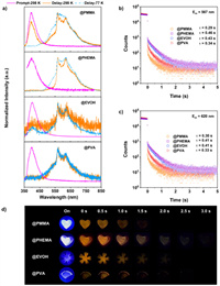 | Fig. 3. (a) Normalized prompt luminescent spectra (red, 298 K, λex = 310 nm) and delayed luminescent spectra (orange for 298 K, blue for 77 K, λex = 365 nm, delay time: 8 ms) of Bd@polymer doped films in air. (b, c) PL decay profiles of Bd@polymer doped films at peaks of 567 and 620 nm in air (298 K, λex = 340 nm). (d) From top to bottom are luminescent photographs of Bd@PMMA, Bd@PHEMA, Bd@EVOH, Bd@PVA captured using Apple 12 Camera before and after turning off the excited UV lights (298 K, λex = 365 nm). The Bd content doped in polymers was 1.0 wt%. | |