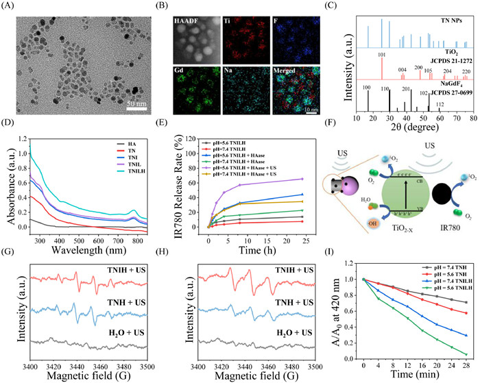 | Fig. 1. Characterization of TNILH nanoformulation. (A) TEM image of TN NPs. (B) HAADF-STEM and elemental mapping images of TN NP. (C) XRD spectra. (D) UV-vis spectra of HA, TN, TNI, TNIL and TNILH. (E) Release rate of IR780 of TNILH dispersed in different conditions. (F) Mechanistic diagram of the synergistic effect of TN NPs and IR780 to enhance the efficiency of ROS production. (G) ESR spectra indicating •OH generation by US-activated TNH and TNIH. (H) ESR spectra indicating 1O2 generation by US-activated TNH and TNIH. (I) The change of absorption intensity of DPBF in different solutions under ultrasound radiation. | |