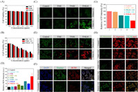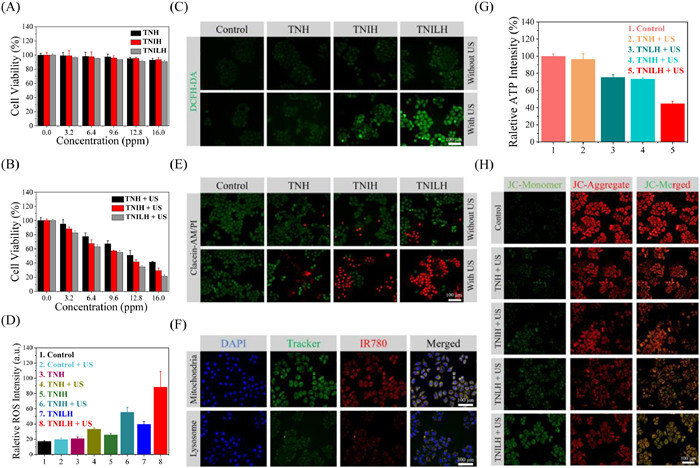 | Fig. 2. In vitro cell apoptosis via the TNILH nanoformulation. (A) Viability of L929 cells after incubation with different concentrations of TNH, TNIH and TNILH. (B) Viability of HeLa cells incubated with different concentrations of TNH, TNIH and TNILH under ultrasound environment. (C) Fluorescence microscopy images of HeLa cells treated with DCFH-DA staining under different conditions. (D) Quantitative analysis of ROS generation in (C). (E) Fluorescence microscopy images of HeLa cells stained with PI (dead cells) and Calcein AM (live cells) after treatment with different conditions. (F) Fluorescence microscopy images of HeLa cells incubated with TNILH for 4h, after treated with Mito-Tracker Green and Lyso-Tracker Green staining kits. (G) The control, TNH, TNLH, TNIH and TNILH group were incubated with HeLa cells for 6h, and the content of ATP was detected after being stimulated by ultrasonic radiation. (H) Fluorescence microscopy images of mitochondrial membrane potential of HeLa cells stimulated by ultrasound radiation after 6 h of treatment with control, TNH, TNLH, TNIH and TNILH. | |