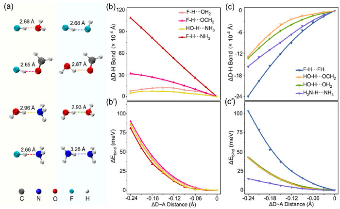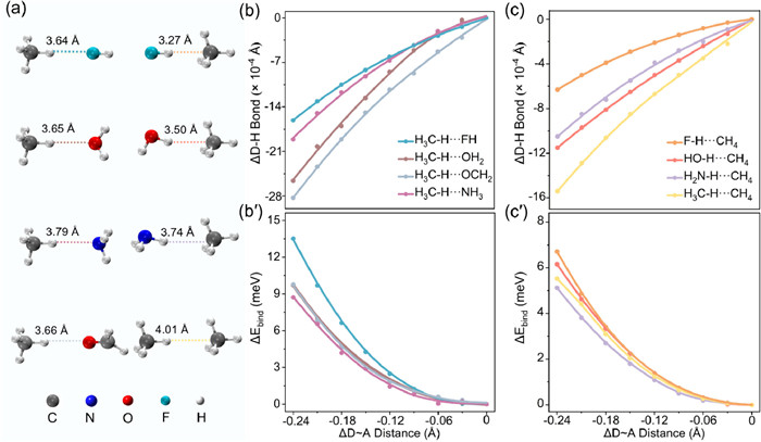 | Fig. 3. The structures and contraction properties of typical non-H-bonded systems. (a) The structures of non-H-bonded systems. Corresponding D~A distances are shown. (b, bʹ) Changes in the D-H bond lengths and the binding energies in the non-H-bonded systems with C as the donor. (c, cʹ) Changes in the D-H bond lengths and binding energies in the non-H-bonded systems with C as the acceptor. | |